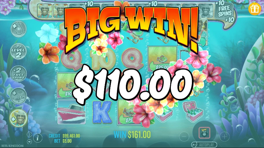 Bigger Bass Splash se déroule à la surface de l’océan, qui est plein de poissons, de bulles, de plantes sous-marines et de vie en général. Au-dessus de la surface, nous voyons des fleurs et des montagnes, qui rappellent l’atmosphère hawaïenne. Le personnage principal, le pêcheur, ne vous sera pas inconnu si vous avez déjà joué à une machine à sous de la série Big Bass, mais les symboles sont différents.