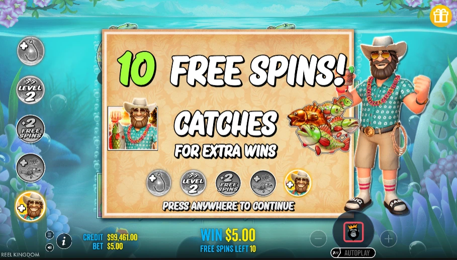 Comme d’habitude, Pragmatic Play a doté cette machine à sous de nombreux symboles et de fonctions bonus. Il y a des symboles traditionnels comme l’As, le Roi, la Reine, le Valet et le 10, ainsi que des symboles uniques qui rapportent plus, comme le bateau, la canne à pêche, l’appât, la boîte et le symbole du poisson (argent). Les scatters déclenchent une partie de tours gratuits, au cours de laquelle le symbole Wild est disponible.